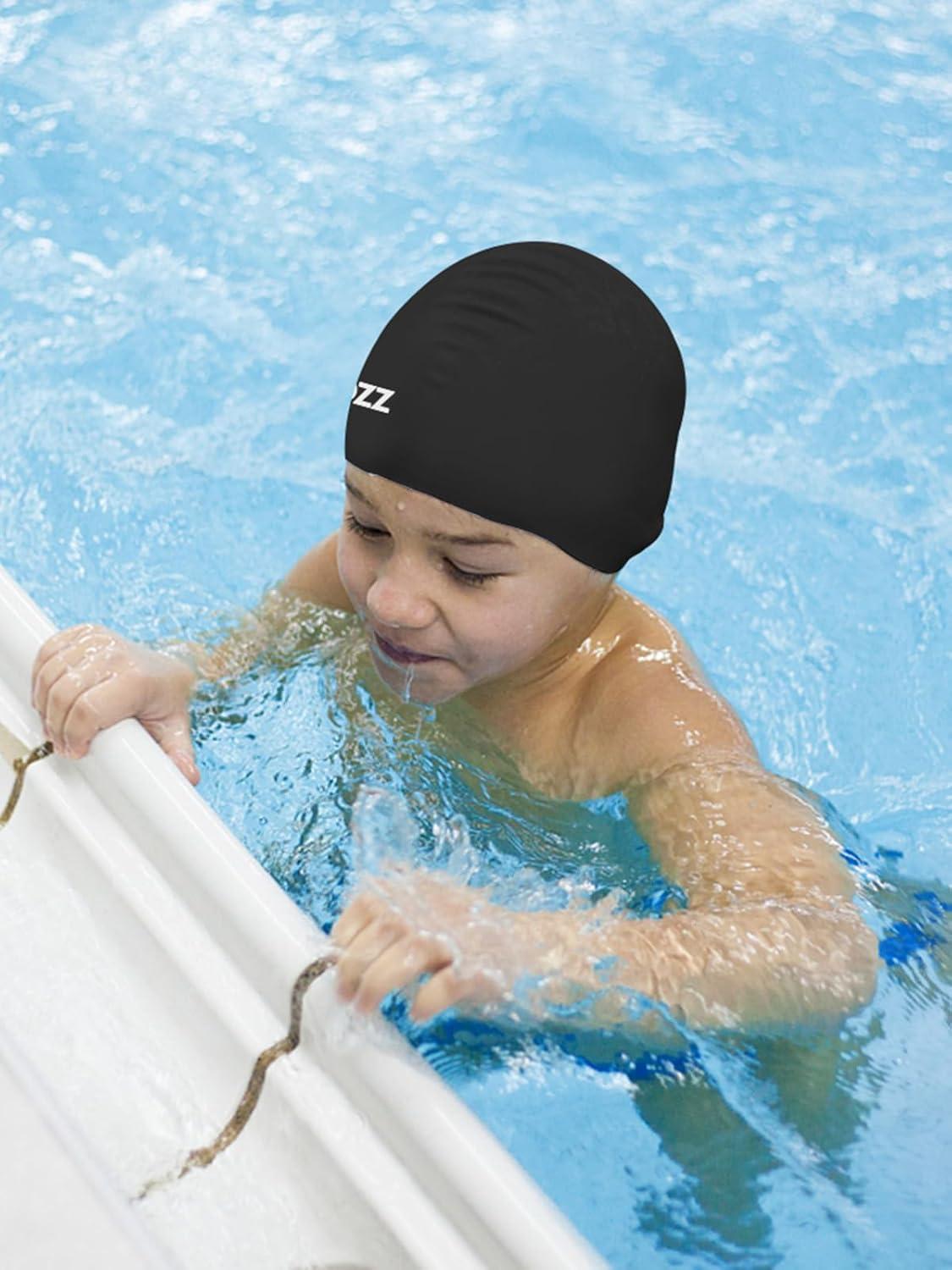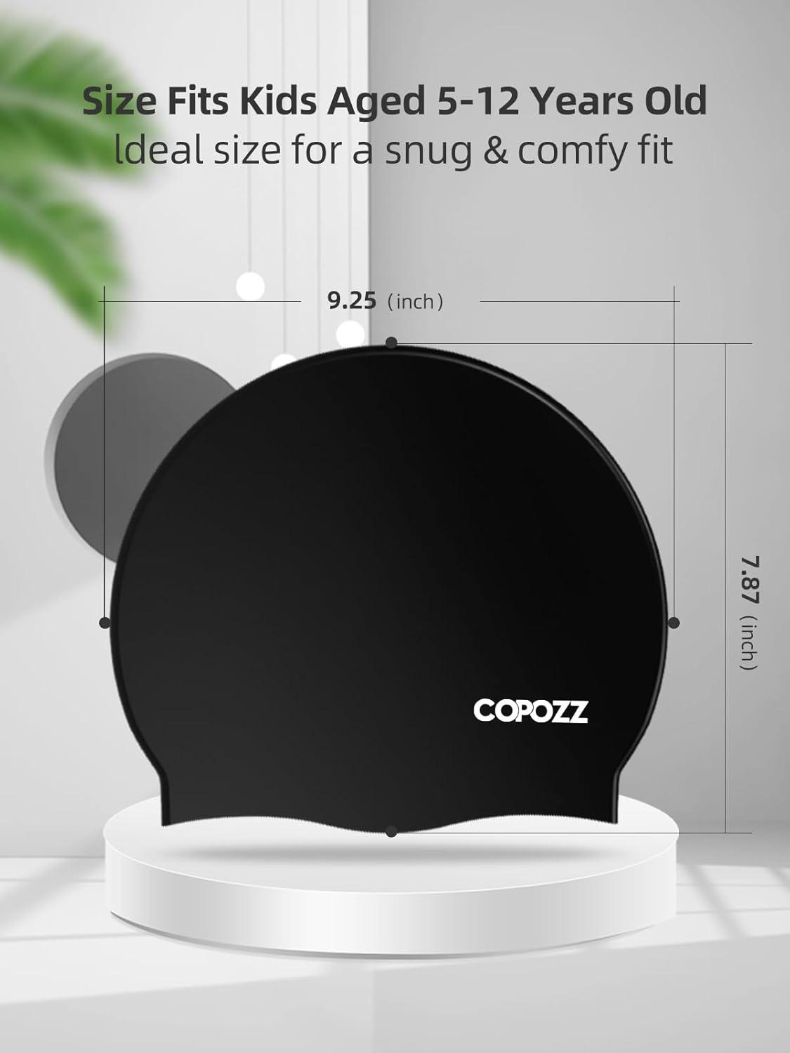 COPOZZ Kids Swim Caps, Silicone Comfy Bathing Cap Swimming Hat for Long and Short Hair(Black-5-12yrs)